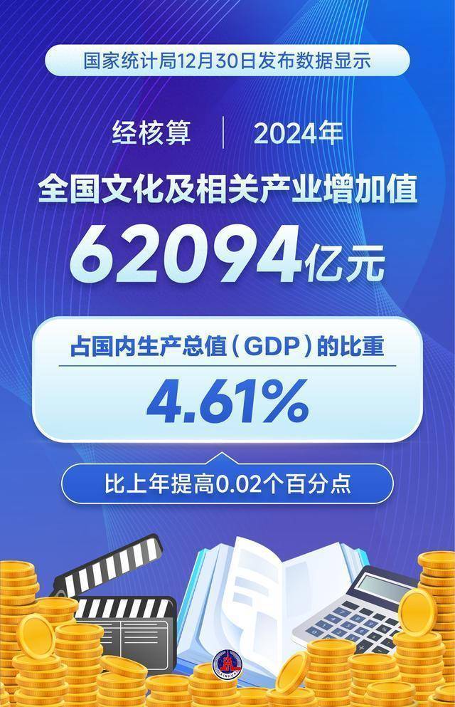 国家统计局12月30日发布数据显示,经核算,2024年全国文化及相关产业增加值为62094亿元,占国内生产总值(GDP)的比重为4.61%,比上年提高0.02个百分点。